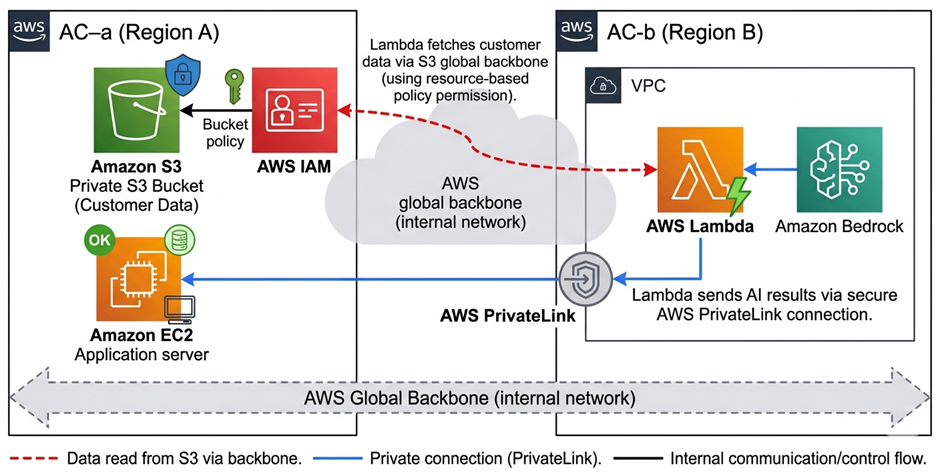 The Lambda function is responsible for analyzing the customer’s document as part of the AI prediction workflow. However, due to regulatory requirements, all customer data must remain stored in AC‑a’s private S3 bucket. However, AC‑b still needs controlled access to this data for analysis. Therefore, the S3 bucket policy in AC‑a must selectively grant AC‑b permission to read only the required objects, while maintaining strict Zero Trust boundaries. This is the authoritative gatekeeper:
