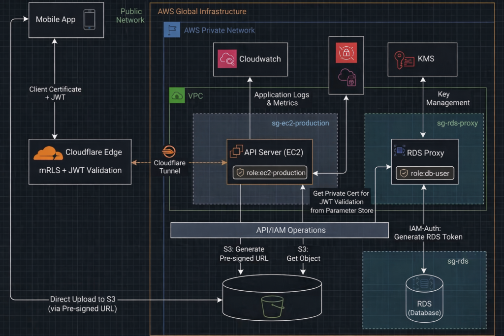 The AWS environment is built around least privilege, no public exposure, and segmented trust boundaries. We enforce this through IAM roles, security groups, resource‑level permissions, and Cloudflare Tunnel.